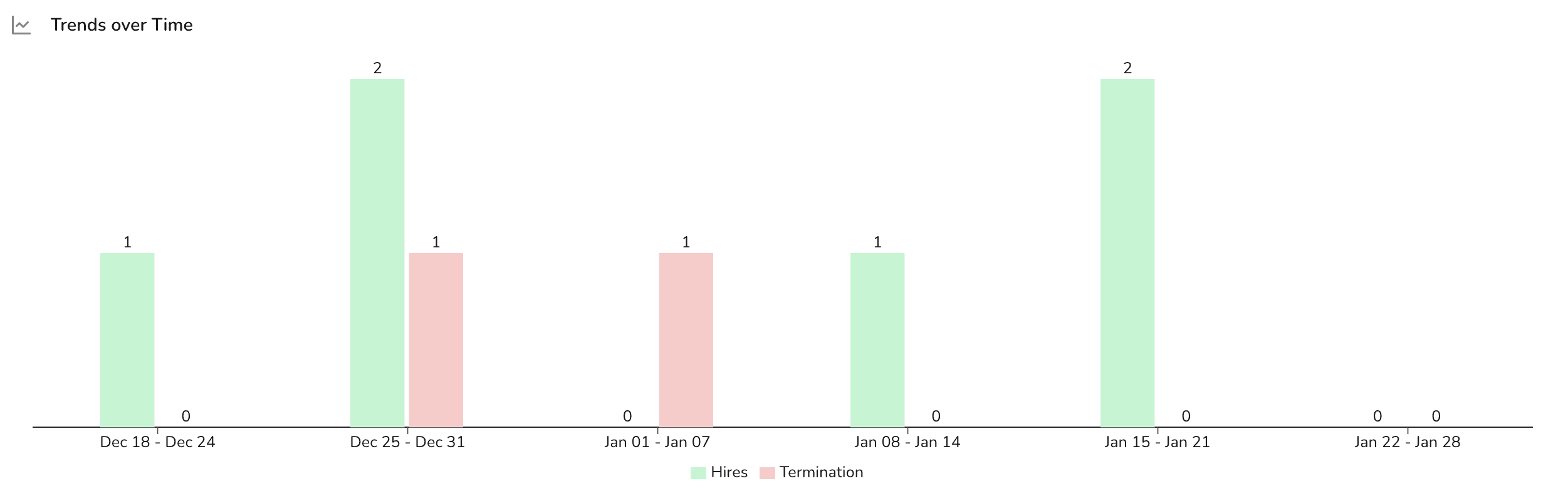 This section of the dashboard assists managers in identifying trends by displaying the number of hires and the number of terminations per week for the last 6 weeks.